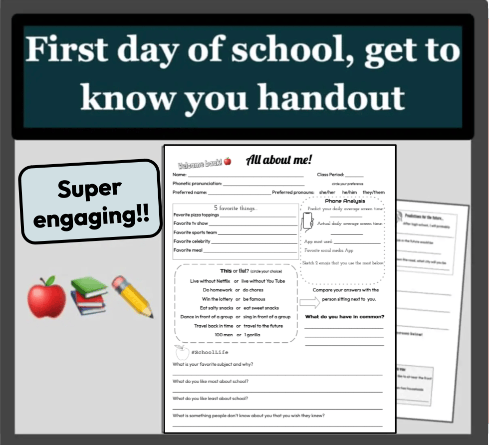 This unique handout blends fun prompts designed to elicit student engagement and foster a collaborative environment, while also allowing you, the teacher, to get to know your students.